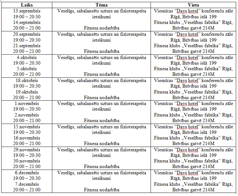 Rīgas domes Labklājības departaments sadarbībā ar biedrību “Veselībai un attīstībai” rīdziniekiem rudenī turpina piedāvāt iespēju bez maksas apmeklēt uztura speciālistu un fizioterapeitu seminārus, kā arī piedalīties fitnesa treniņos pieredzējušu speciālistu uzraudzībā.